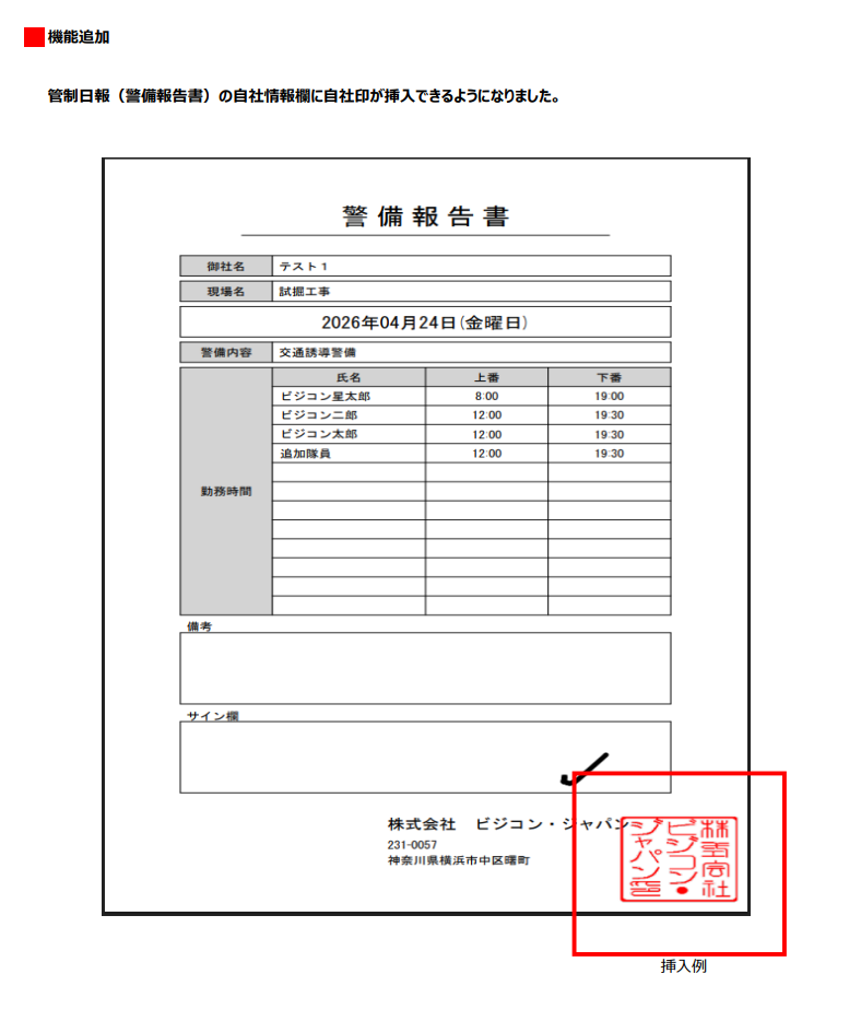 管制日報に自社印を挿入する機能を追加いたしました。